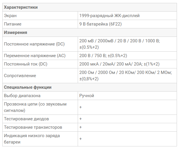 Этот прибор - один из серии карманных 3,5 -разрядных цифровых мультиметров для измерения постоянного, переменного напряжения, постоянного тока, сопротивлений, проверки диодов и транзисторов. Мультиметр снабжен защитой от перегрузки на всех пределах измерений и индикацией разряда батареи. Это идеальный инструмент для использования в лабораториях, цехах, для хобби и для работы дома.
